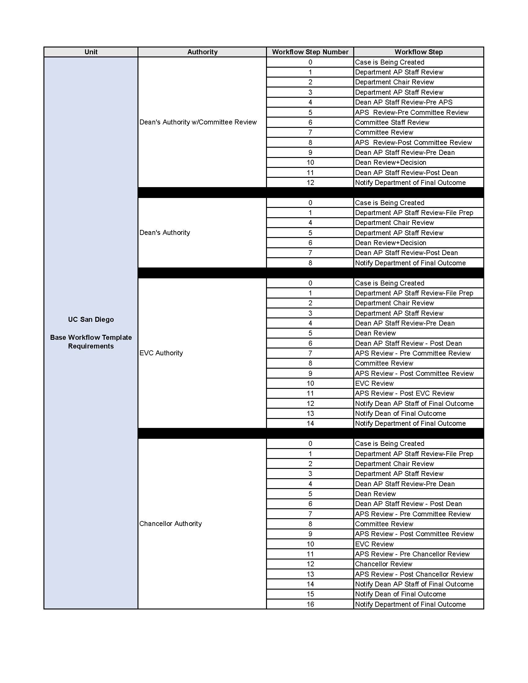 UC San Diego employs the use of several policy driven workflow templates for departments and schools to use when processing academic review and appointment actions. Departments and schools have some flexibility in how they design their specific workflow templates as long as they observe and maintain policy driven workflow requirements. Below is a breakdown of UC San Diego's foundational policy driven workflow requirements as well as a breakdown of workflow templates separated by school, department, action, and delegated authority.